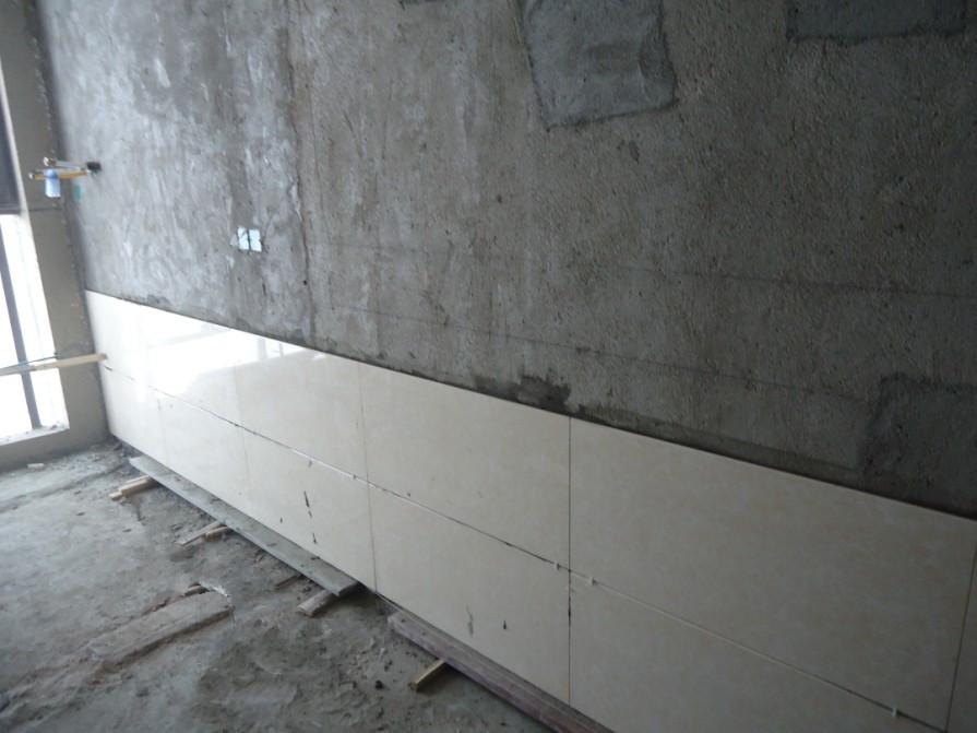 墻面粘接劑批刮面積過大,表層固化后再貼磚會導(dǎo)致空鼓、脫落;墻面每次批刮瓷磚粘接劑約1平米左右,墻面干燥時要預(yù)先潤濕墻面。