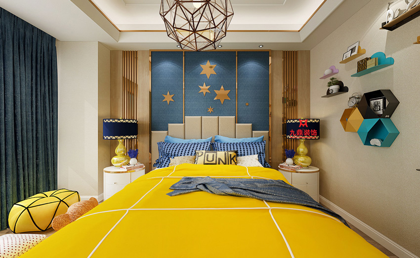 環(huán)境對于孩子的心理成長很重要,因此兒童房的色彩應(yīng)該鮮艷﹑明快﹑對比強(qiáng)烈??梢跃植窟\(yùn)用彩度較高的黃色﹑藍(lán)色﹑也可以把一些對比度較大的色彩組合在一起。強(qiáng)烈的色彩可以刺激孩子的大腦,讓孩子充滿幻想,思維活躍。兒童房的織物陳設(shè)不宜成人化,應(yīng)該考慮兒童的心理﹑生理和成長發(fā)育的特點(diǎn)??椢锏纳蕬?yīng)該鮮明,圖案應(yīng)該具象,使房間充滿生動活潑的氣氛。