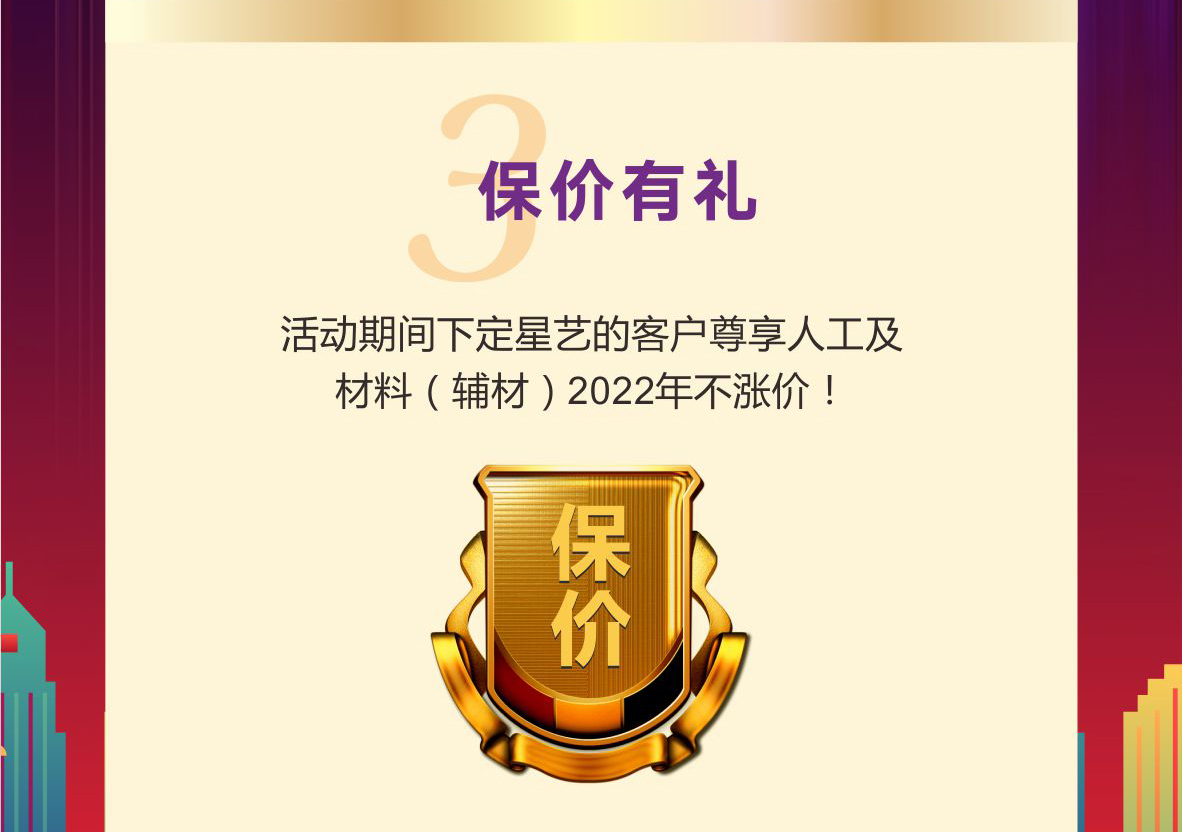 環(huán)保、運輸、限電政策嚴格管控下,材料上漲、人工上漲導致裝修成本越來越高。為減少業(yè)主裝修煩腦,回饋廣大新老客戶,按集團總部統(tǒng)一部署,舉行2021年“歲未感恩.暖冬行動”全國跨年鉅惠大聯(lián)動活動,給八桂裝修業(yè)主帶來一場保質(zhì)更保價的高品質(zhì)家裝盛會。本次活動星藝特別承諾:活動期間下定,2022年裝修享2021年單價等以下多重好禮鉅惠,具體優(yōu)惠細則如下: