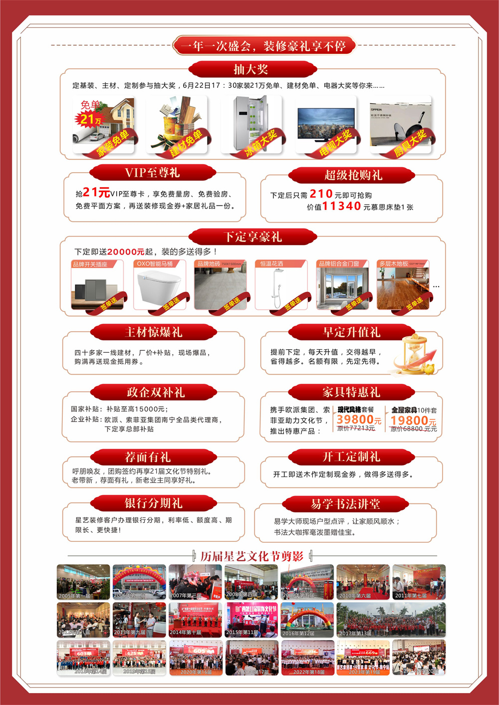 2025年中國(guó)星藝第21屆家裝文化節(jié),全國(guó)400多家直營(yíng)門店聯(lián)動(dòng),年度巔峰讓利,搶2億裝修豪禮,讓幸福啟程。星藝人將以最專業(yè)的團(tuán)隊(duì),最經(jīng)典的設(shè)計(jì),最貼心的服務(wù)、最堅(jiān)實(shí)的品質(zhì)、最期待的鉅惠,將一場(chǎng)裝飾文化盛宴,獻(xiàn)禮綠城,具體優(yōu)惠如下: