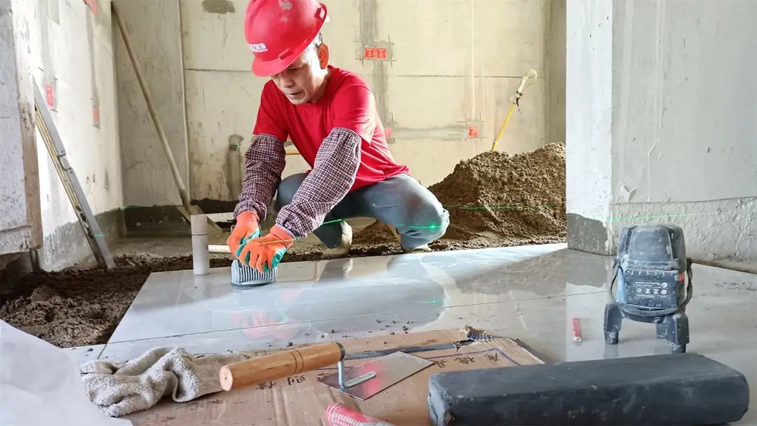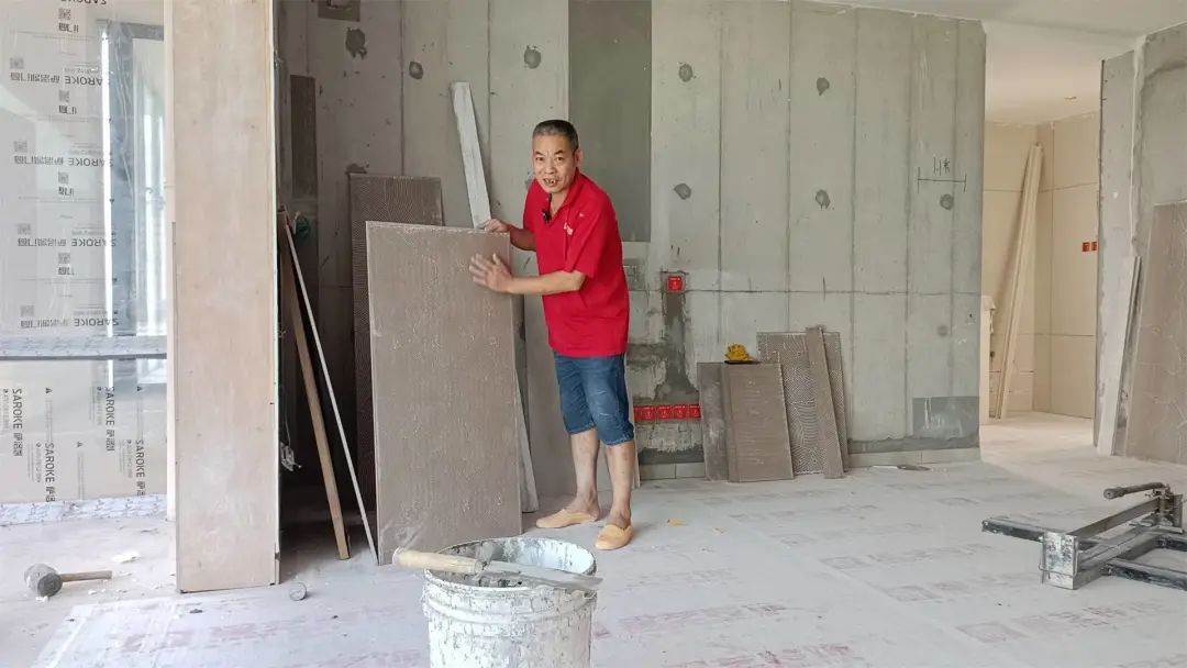 莫樹文以前鋪800毫米×800毫米的瓷磚,每天能鋪10平方米左右,現(xiàn)在鋪750毫米×1500毫米,一天依然只能鋪10平方米左右,因?yàn)楸仨毎阉俣确怕?,才能確保大磚鋪貼的質(zhì)量。其中一個(gè)鋪地磚的細(xì)節(jié)顯示,每塊大磚必須排版試鋪,再根據(jù)具體情況用干沙微調(diào)沙漿層,直至調(diào)平,然后才能正式上漿鋪貼。莫樹文說,如果不試鋪,直接用濕漿來找平,就容易因濕漿厚度不一、干燥速度不一樣而出現(xiàn)空鼓,圖省事或缺乏經(jīng)驗(yàn)的工人會省掉這個(gè)環(huán)節(jié)。