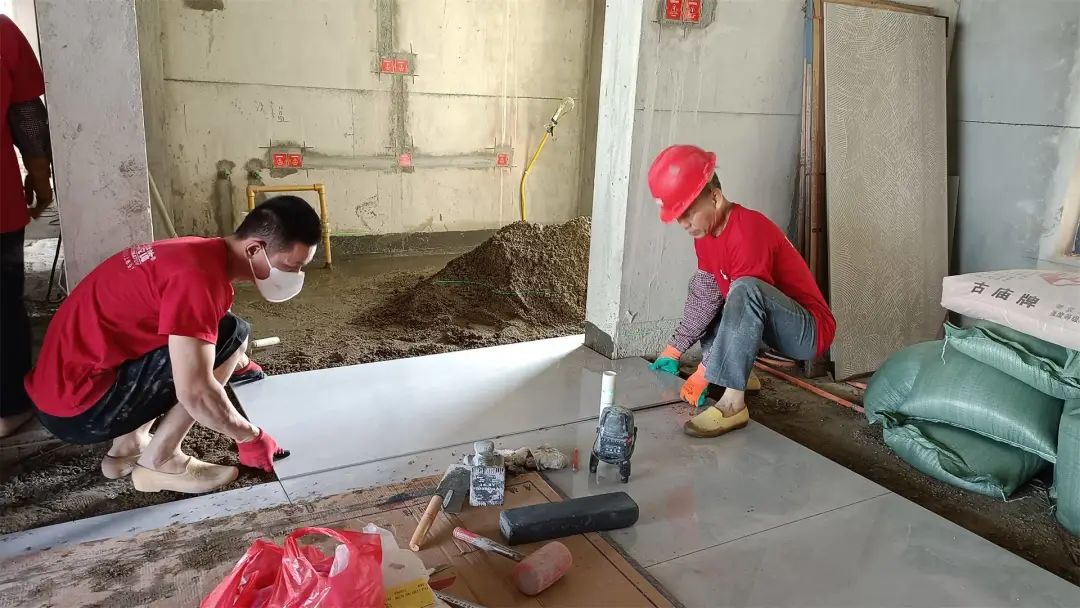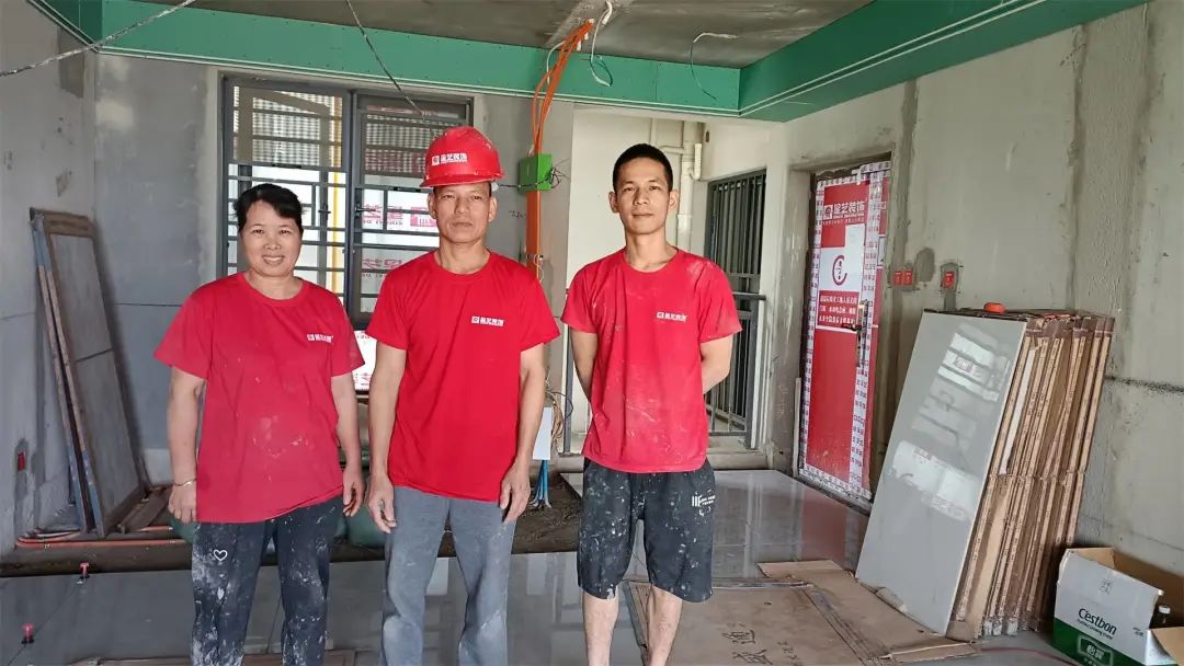 兩位鋪磚老師傅除了自己優(yōu)秀,還影響到了下一代,先后將兒子帶入裝修行業(yè),且加入星藝南寧,成為了“星二代”。莫樹文的兒子莫炳健1992年出生,2014年底進(jìn)入星藝南寧,迄今已有8年時(shí)間。莫炳健在星藝干的這8年,一直專注于鋪磚工藝。2022年11月上旬,父子搭檔鋪磚的身影出現(xiàn)在南寧西園悅府小區(qū)一個(gè)星藝工地?,F(xiàn)場所鋪的地磚較大,每片地磚需父子兩人配合才能鋪好。工地上,還有莫樹文的妻子幫忙,協(xié)助父子拌漿、上漿。一家人同框出現(xiàn)在一個(gè)工地的場景,畫面默契而又溫馨。