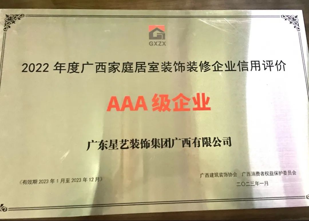 行業(yè)認(rèn)可 | 星藝廣西獲評(píng)2022年度廣西家庭居室裝飾裝修企業(yè)信用評(píng)價(jià)3A級(jí)企業(yè)