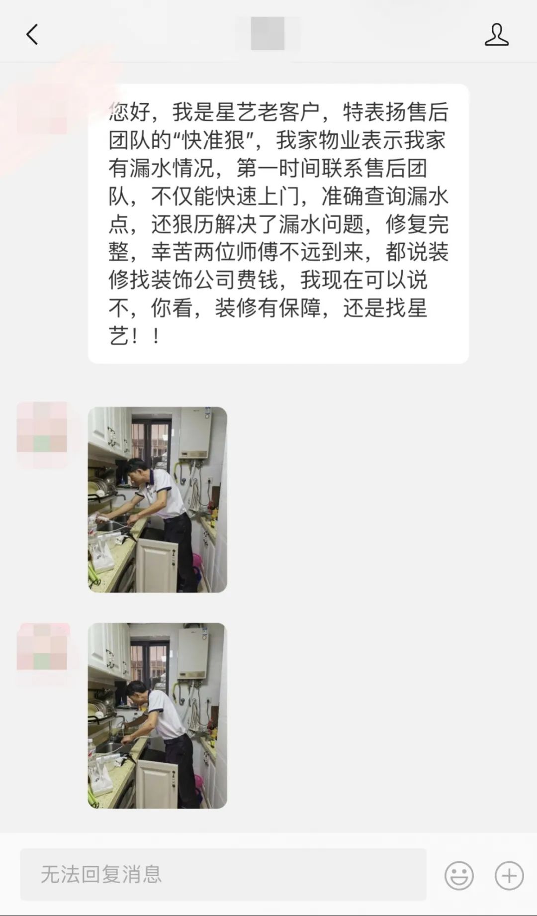 在服務(wù)月期間,有位2016年的老客戶主動(dòng)聯(lián)系我們,經(jīng)過售后部門核對(duì)后立即安排工程部項(xiàng)目監(jiān)理周平彬上門為老客戶排查問題,事后客戶十分認(rèn)可星藝裝飾的服務(wù)。 還有在回訪解決完一位榮和山水綠城業(yè)主的廚房問題后,業(yè)主深受觸動(dòng),親自到公司官微留言,贊許星藝裝飾“裝修有保障”。