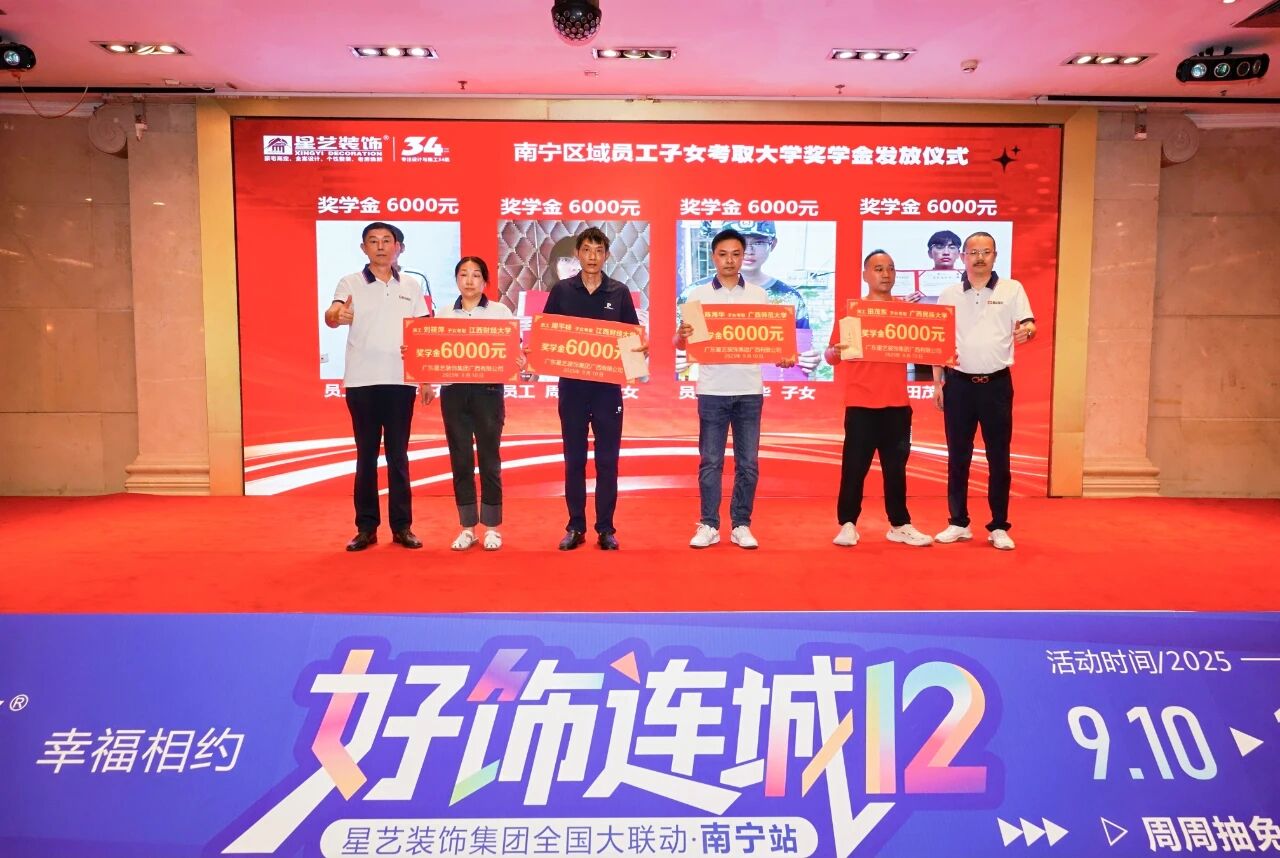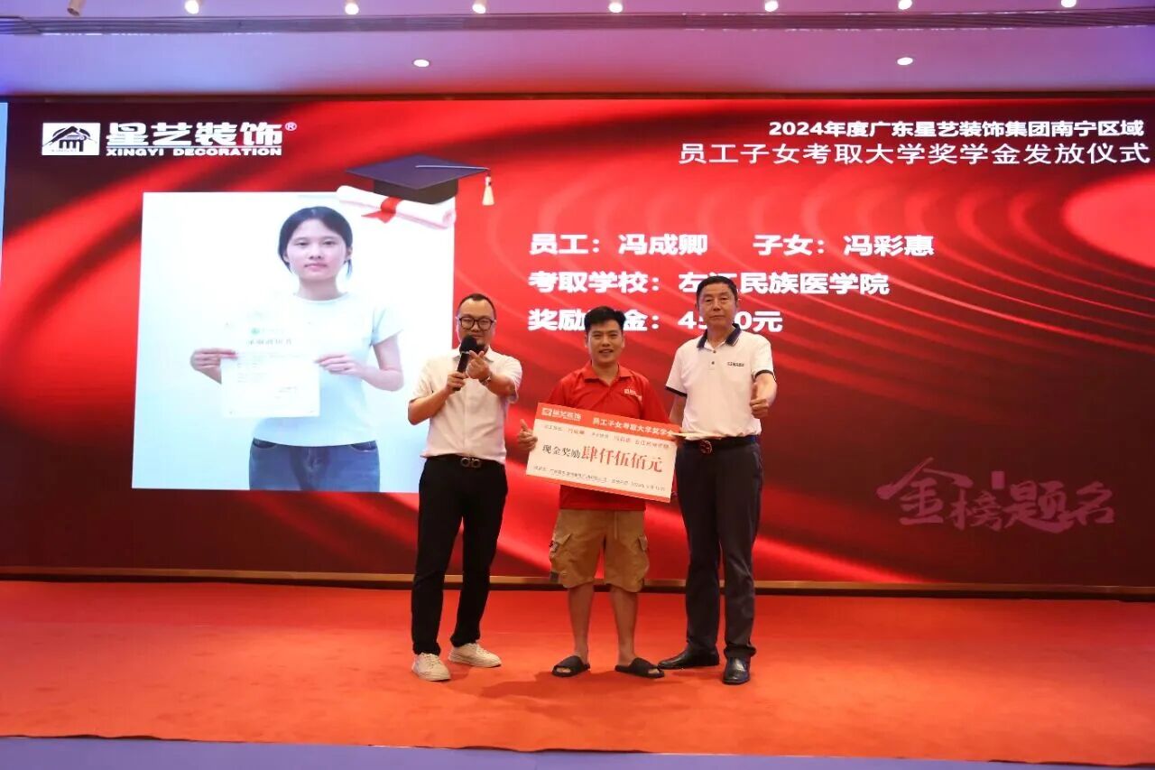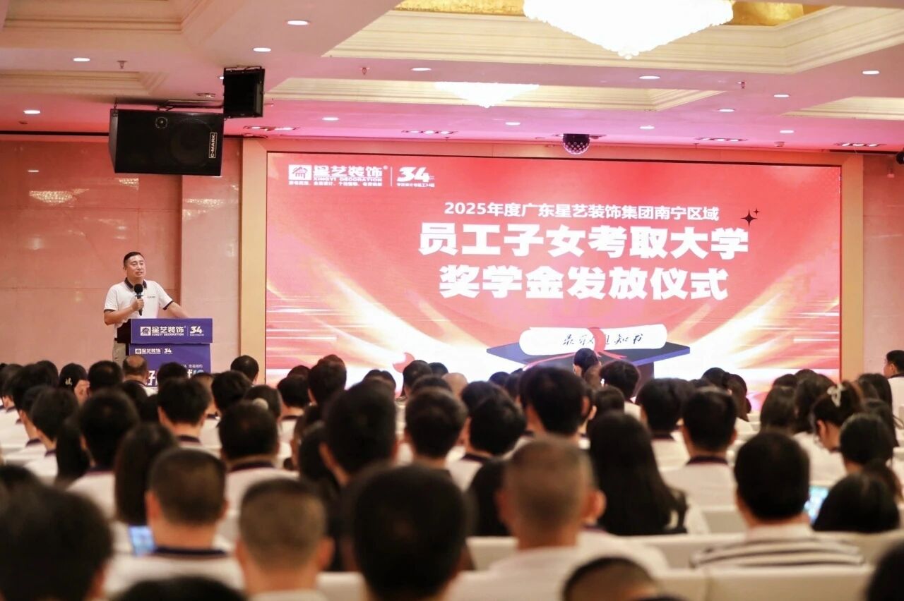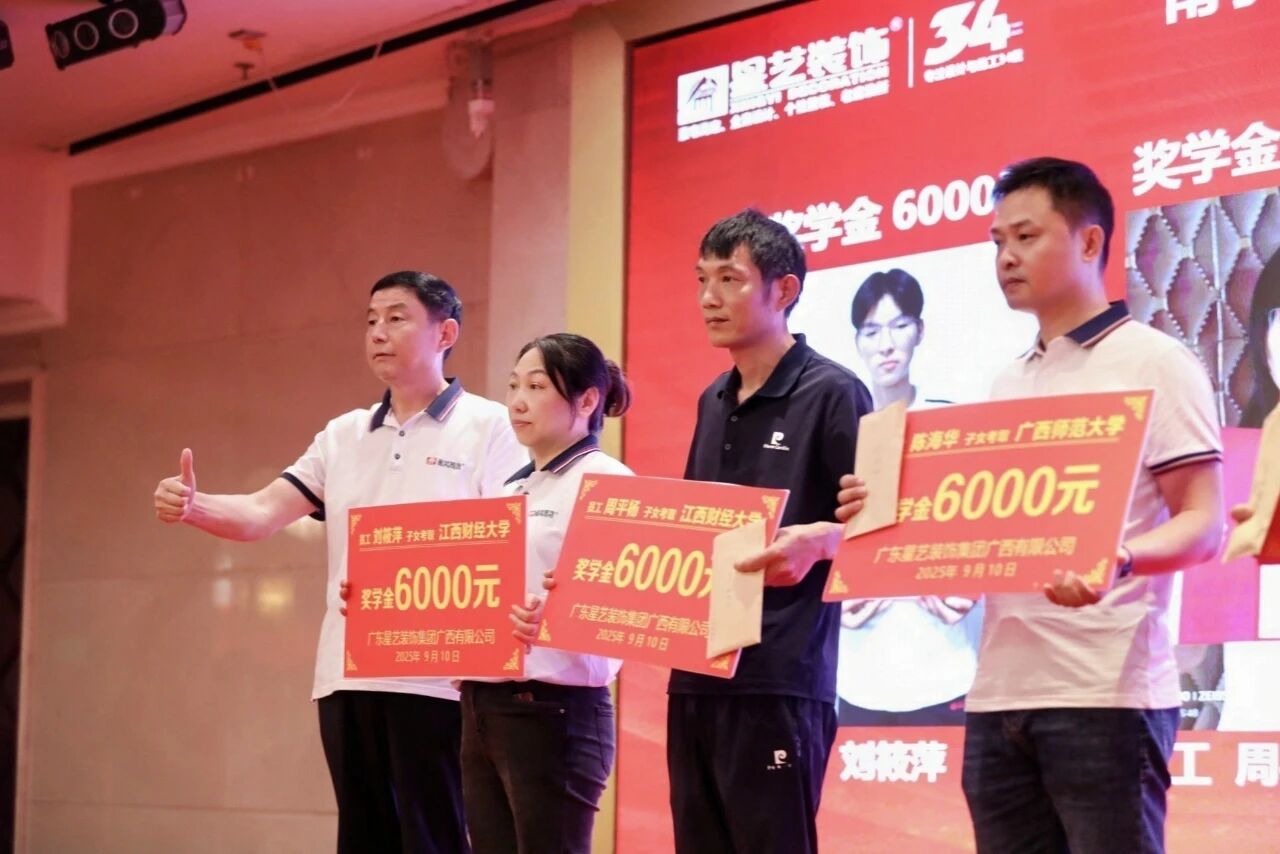 9月10日,2025年度星藝南寧區(qū)域員工子女大學獎學金發(fā)放儀式在南寧金旺角國際酒店會議室溫情舉行,在四百多名星藝南寧家人的共同見證下,星藝南寧區(qū)域總經理周平生、星藝南寧區(qū)域設計總監(jiān)李明為星藝員工劉筱萍、周平楊、陳海華、田茂東四位考上大學的“星二代”頒發(fā)星藝獎學金,代表星藝裝飾關愛員工家庭,重視人才培養(yǎng),鼓勵“星二代”們奮發(fā)向上,努力學習,在求學路上深耕精研,成為國家棟梁。